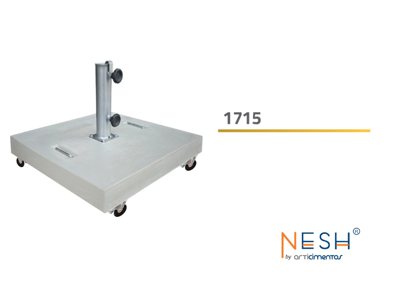 Base de chapéu quadrada, em betão natural cinza, com 4 rodas, com acabamento liso.